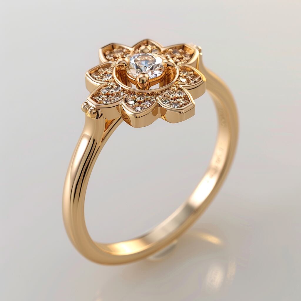 中央に輝く美しいダイヤモンドを囲むように、小粒のダイヤモンドが花びらのように配置され、手元を優雅に彩ります。リング部分はシンプルでなめらかなデザインだから、普段使いから特別な日まで、幅広く活躍します。