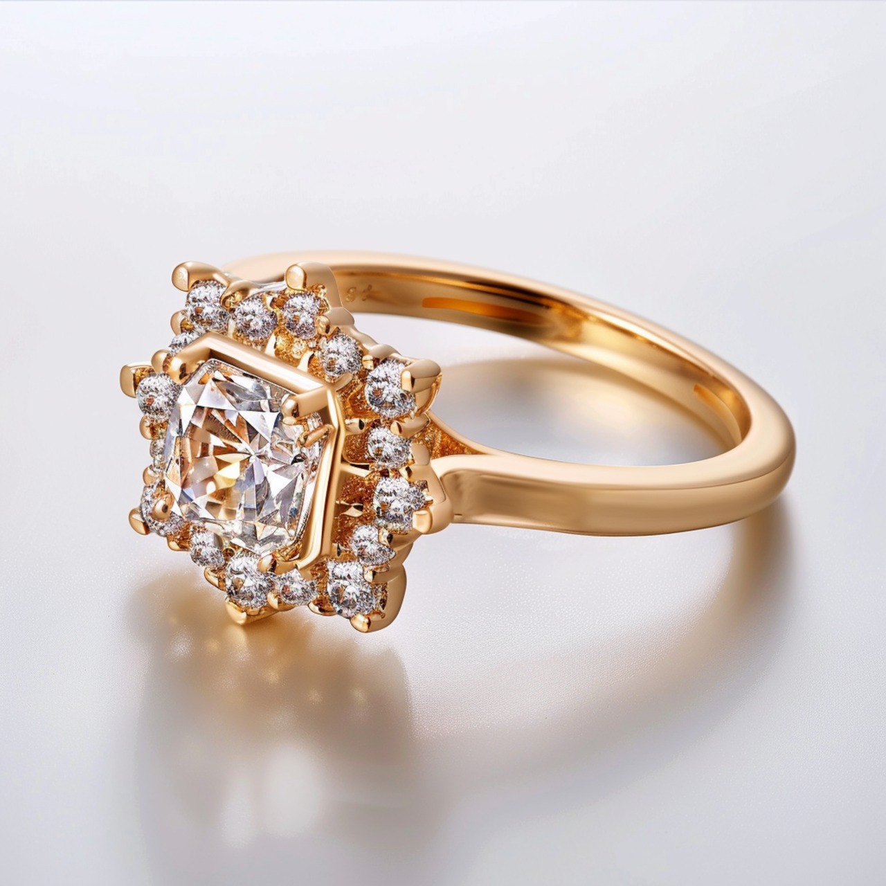 中央のスクエアダイヤモンドの周りを大小交互に取り巻くダイヤモンドが、シャープになり過ぎないデザインを表現するように仕立てています。程よいボリューム感がありながらも上品なデザインで、指元を華やかに飾ります。日常使いにも特別なシーンにもぴったりな一品です。