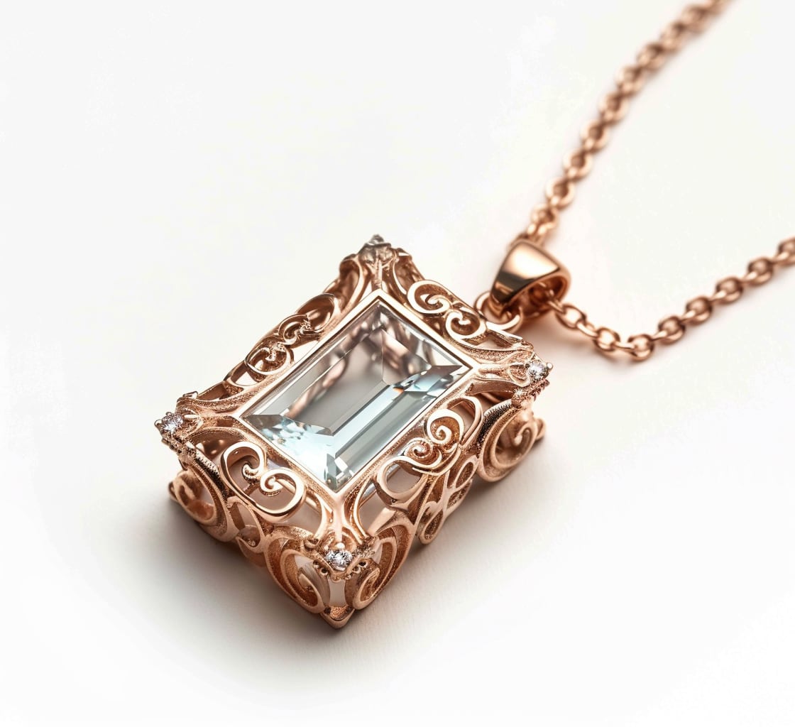 このペンダントは、美しいローズゴールドのフレームに包まれた長方形のクリアストーンが主役。立体感のあるヴィンテージ風デザインと繊細な装飾が、特別な存在感を放ちます。上品で洗練された雰囲気を醸し出し、日常使いからフォーマルな場面まで幅広く活躍します。