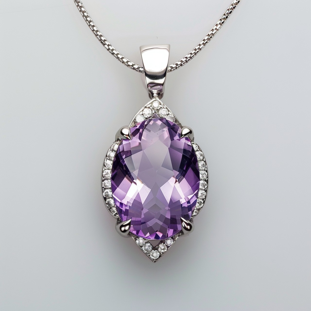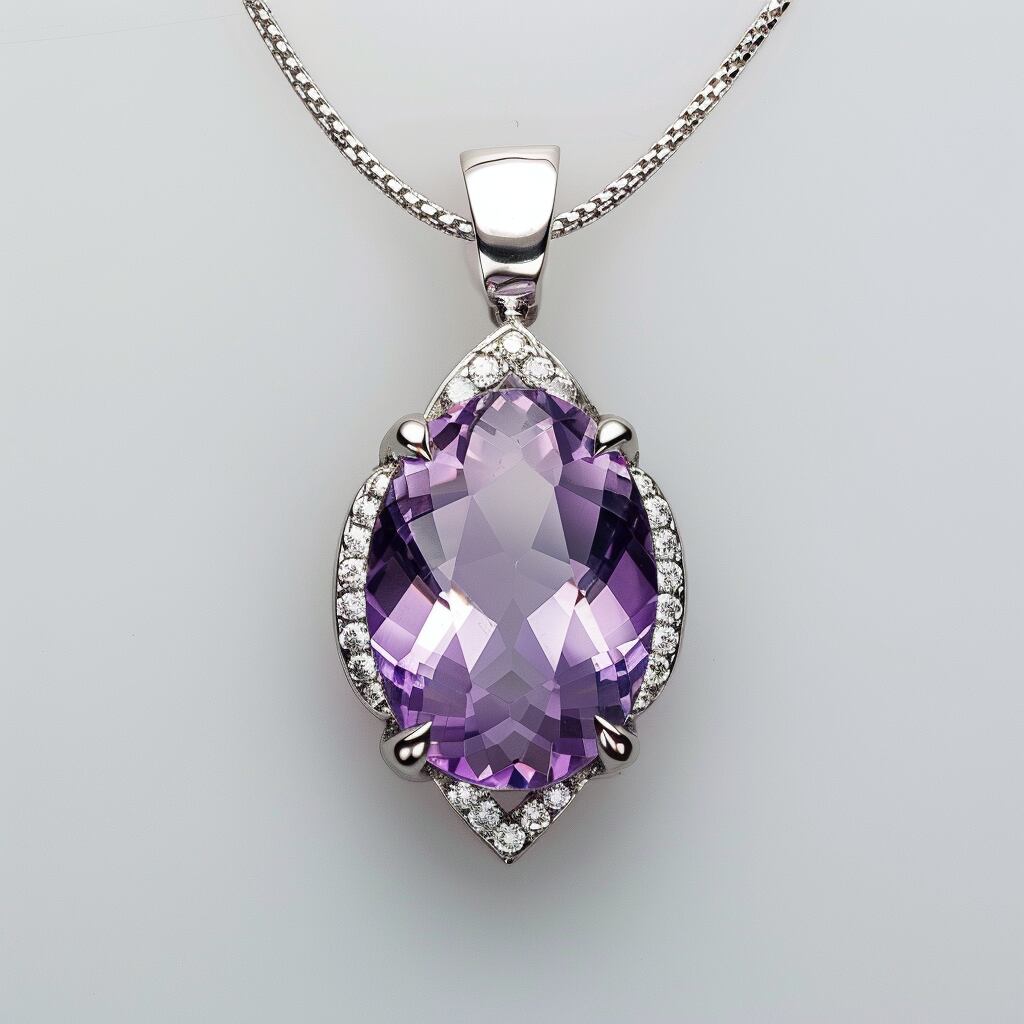 深みのあるアメジストを使用した、このプラチナペンダントは、エレガントさと洗練さを兼ね備えた逸品。石を囲むダイヤモンドが、アメジストの鮮やかな紫色をさらに引き立て、まるで胸元に輝く芸術作品のような美しさを放ちます。