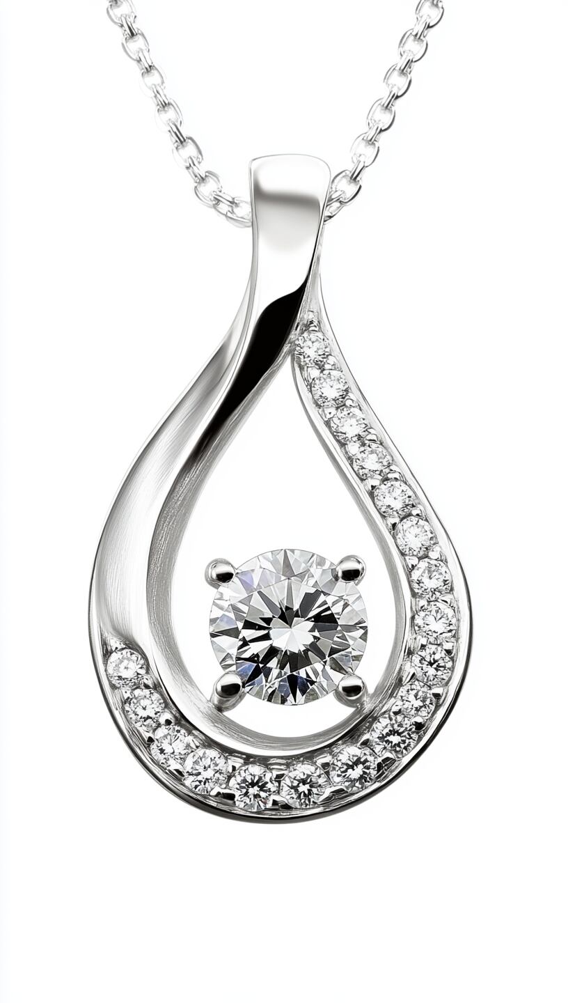 シンプルかつモダンなデザインが特徴のプラチナティアドロップペンダント。中心に輝くラウンドカットのダイヤモンドは、高い透明感と輝きを誇り、周囲にあしらわれた小粒のダイヤモンドがさらにその美しさを引き立てます。プラチナの高級感ある質感とシルエットが、特別な日や日常に洗練された輝きをプラスしてくれます。